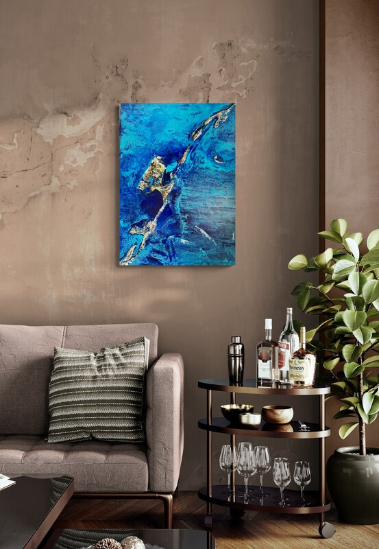 Semi-abstrait réalisé en techniques mixtes via des encres, aquarelles et acryliques sur un châssis entoilé/coton.